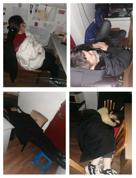 于是大家都开始打电话回家。过一会,到了小区封门的时间,雨还在一点一点的下。办公室里没被子,也没更多保暖衣物,更不可能有床。几个物业人你看看我,我看看你,女同志就紧挨在一起,靠在沙发上,闭上眼睛,能休息就休息一会儿!两个男同志找来几张凳子拼凑在一起,当个简易床躺一会儿。半夜不舒服了,坐起来走一会儿,就这么着天开始亮了。